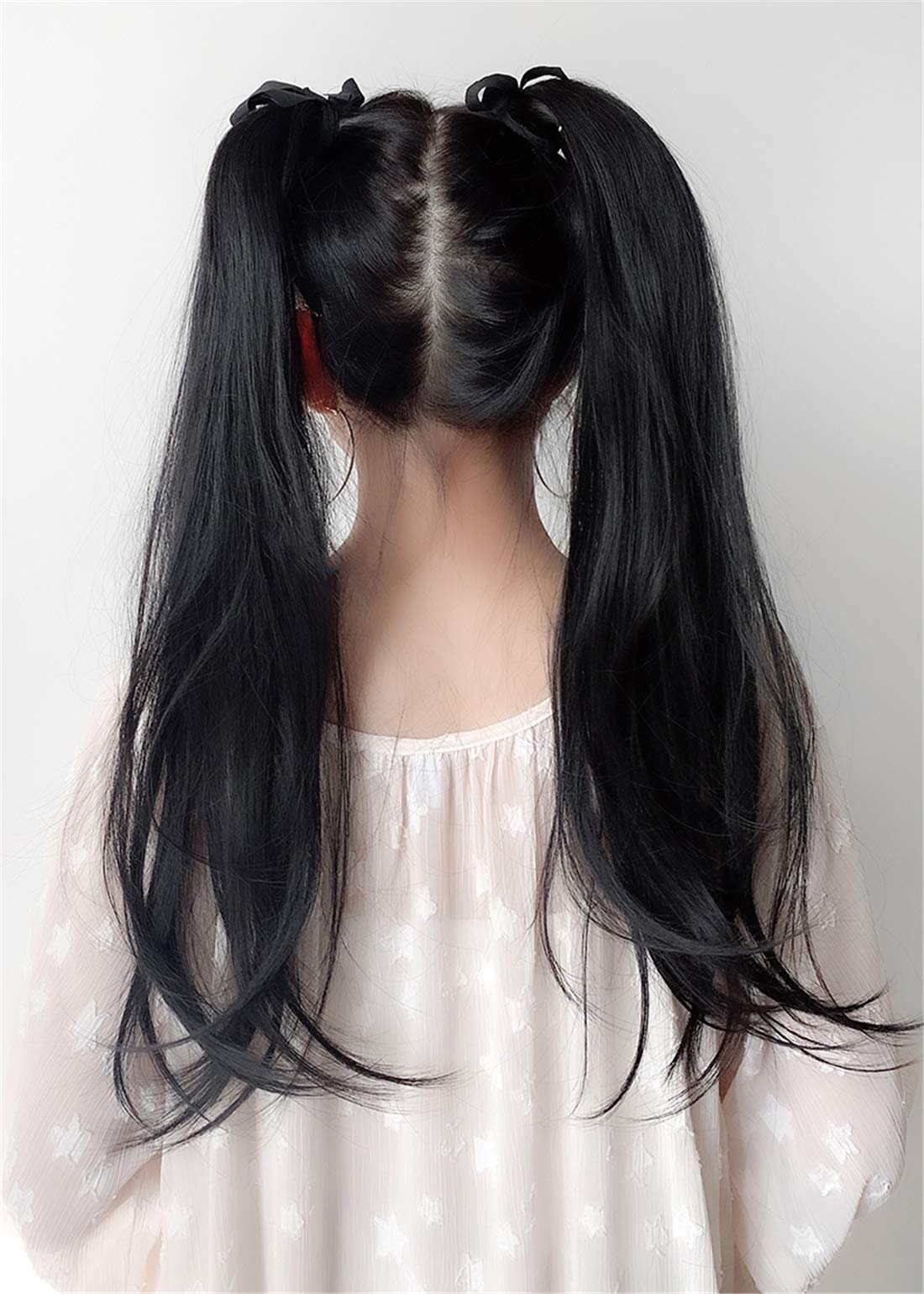 Amazon Com Yanamy 24 Long Straight Twin Ponytail Hair Extensions Ribbon Cosplay Pony Tails For Cutey Black Beauty Personal Care